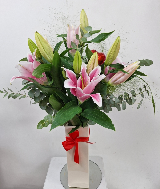 Stylish vase containing 3 stems of Oriental Lily & foliage.  ( vase may vary from picture)